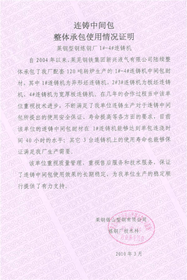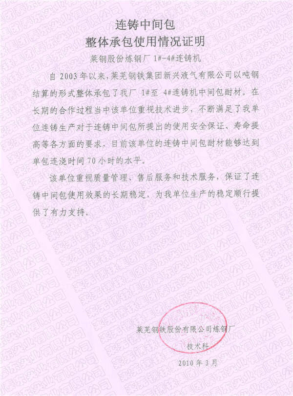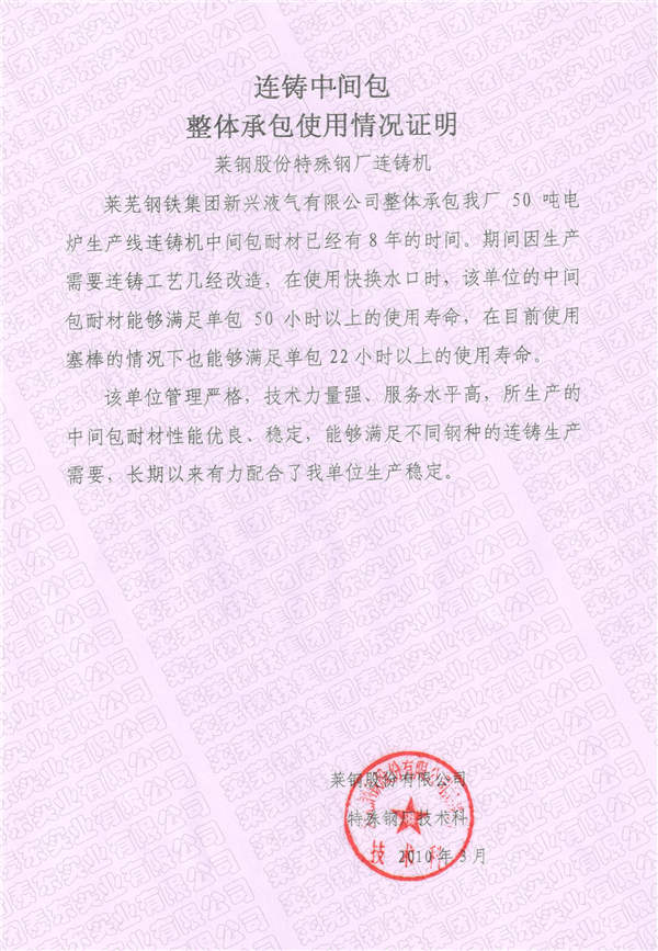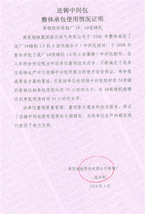 公司以雄厚的技术力量承担着莱钢全部12台连铸机中间包耐火材料的整体承包服务,经过多年的发展,公司已经形成了对连铸中间包耐火材料方案设计、生产、研发、现场施工及售后服务为一体的综合体系。目前,在莱钢中间包连拉炉数更是突破100小时,达到国内领先水平。